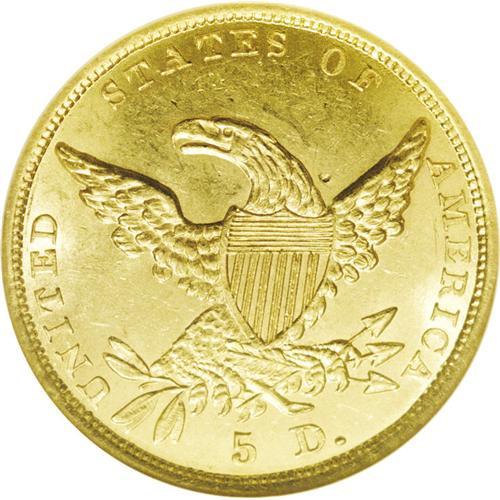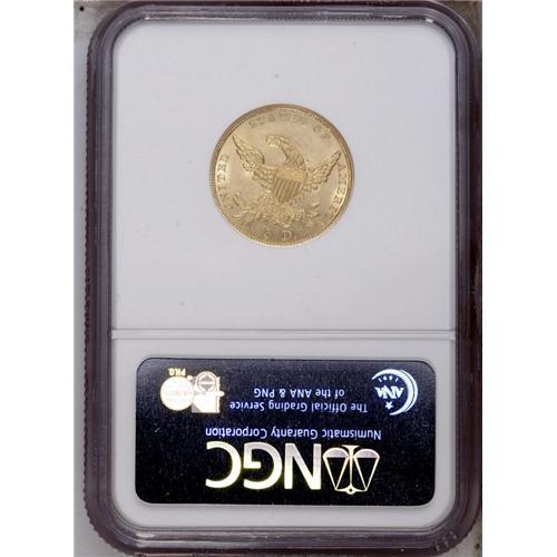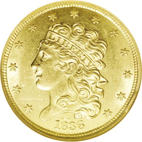 <B>1836<$5> MS61 NGC.</B></I> Breen-6509, Second Head, Large Date, McCloskey 4-D, R.3. Always a highly sought-after type coin in mint condition, the 1836 is a scarcer date in the Classic series. Probably fewer than 200 pieces are known today in the various grades of Uncirculated. This is a bright, lustrous example with yellow-gold color. The striking details are strong throughout and the only mentionable mark is a tiny dig to the right of the eagle's neck.