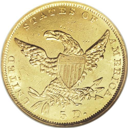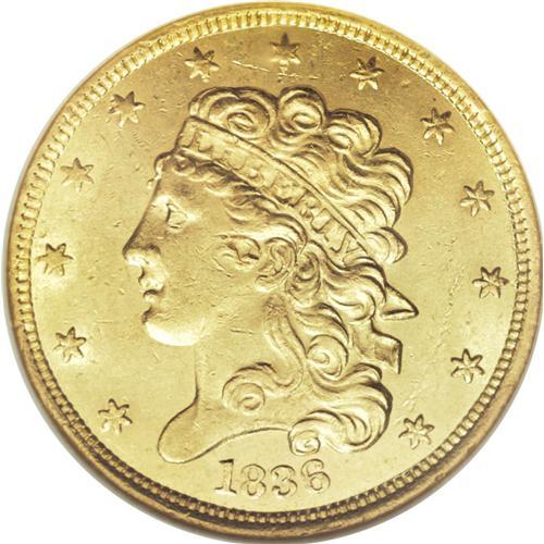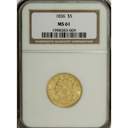 <B>1836 $5 MS61 NGC.</B></I> Second Head, Large Date, Breen-6509, McCloskey 4-C, R.3. From a mintage of well over a half-million pieces, this is the second-most common issue of the Classic Head half eagle type. This Mint State example boasts shimmering luster and light greenish coloration. Numerous small marks define the grade.<BR><BR><b>Shipping:</b> Coins & Currency (<a target="_blank" href="http://www.heritageauctions.com/common/shipping.php">view shipping information</a>)