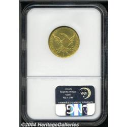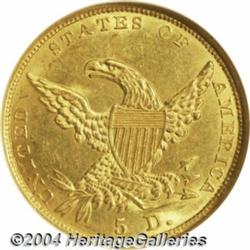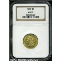 <B>1836<$5> MS62 NGC.</B></I> Breen-6509, McCloskey-4D. R.3. This is one of the more common die varieties among 1836 half eagles and should be a good candidate for the date or type collector. Fully brilliant greenish-gold surfaces with frosty luster and very sharp design features. A delightful example with plenty of eye appeal. While not rare in general terms, all Classic Head gold coins are elusive in any Mint State grade. <BR><BR><B>Important notice:</B> Heritage usually auctions material at the rate of 200-250 lots per hour. On some occasions eBay Live bid software or the Internet may not be able to keep up with the pace of the auction. We recommend placing a realistic absentee bid now as insurance to avoid disappointment. Occasionally the auctioneer may eliminate or reject an eBay Live bid, and the auctioneer may also reopen a lot after the close of the eBay live bidding (usually because we missed an audience bid), and may reject your bid even if it shows you as the winning bidder. By bidding via eBay Live, you agree that Heritage may award the lot to another bidder at its sole discretion under the circumstances described above or any other reasonable circumstances. Since eBay bids are not shown to us until we open the lot on the floor, we treat those bids just like floor bids. In most cases the floor responds before the eBay bid is presented to us, due to Internet lag time, so for consistency we have made it a policy that floor bids are always considered first over tie eBay live bids. Also please note that all Heritage lots purchased through eBay Live carry a 20% Buyer's Premium. Please make sure you read the Terms and Conditions before you bid. </span></font></tr></table></td></tr></table>