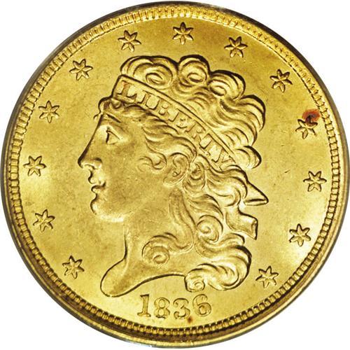 <B>1836<$5> MS62 PCGS.</B></I> Breen-6509, Second Head, Large Date, McCloskey 4-D, R.3. A frosty example of this second-most common Classic Head issue, but a difficult type coin at the Mint State level. The devices are boldly struck in all areas and the yellow-green surfaces suffer only from wispy marks and a couple of small alloy spots near the obverse rim, one just above star 10 and another just below the 3 in the date.