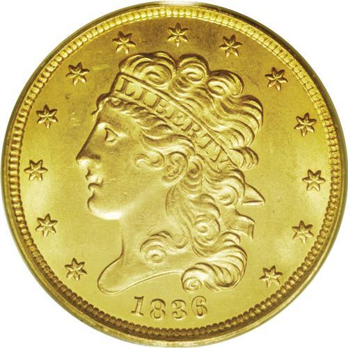 <B>1836<$5> MS64 PCGS.</B></I> Breen-6508, Second Head, Small Date, McCloskey 5-D, R.3. The variety is confirmed by the wide rounded end to the truncation, the double forelock, the 1 in the date at the same level as the 8, and the large 5 in the denomination. With a mintage of 553,147 pieces, the 1836 is one of the most common dates of the Classic Head design type. Mint State pieces are available through the MS62 level, but the population begins to taper off in MS63.<BR> The design elements on the MS64 specimen offered here display a better-than-average strike. The hair curls at Liberty's forehead and temple, while not quite full, still show nice definition. Peach-gold surfaces display a semi-bright, satiny sheen, and are imbued with subtle light green undertones. Some minute handling marks on Liberty's cheek and neck and in the left (facing) obverse field define the grade. A few wispy unobtrusive hairlines are mentioned solely for accuracy, and do not in the least detract from the coin's great eye appeal. Population: 20 in 64, 2 finer (4/06).