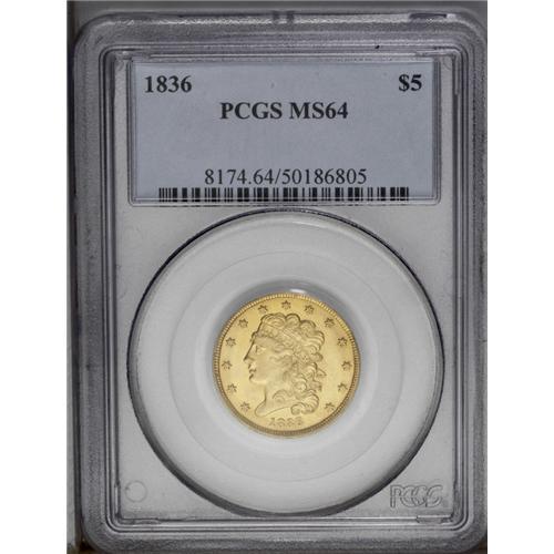<B>1836 $5 MS64 PCGS.</B></I> Breen-6508, Second Head, Small Date, McCloskey 5-D, R.3. The variety is confirmed by the wide rounded end to the truncation, the double forelock, the 1 in the date at the same level as the 8, and the large 5 in the denomination. With a mintage of 553,147 pieces, the 1836 is an available date of the Classic Head design type. Mint State pieces are available through the MS62 level, but the population begins to taper off in MS63.<BR> The design elements on the MS64 specimen offered here display a better-than-average strike. The hair curls at Liberty's forehead and temple are nearly complete, and the shield lines are bold. Peach-gold surfaces display a semi-bright, satiny sheen, and are imbued with subtle light green undertones. Some minute handling marks on Liberty's cheek and neck and in the left (facing) obverse field define the grade. A few wispy unobtrusive hairlines are mentioned solely for accuracy, and do not in the least detract from the coin's great eye appeal. Population: 16 in 64, 2 finer (10/06).<BR><BR><b>Shipping:</b> Coin/Currency (<a target="_blank" href="http://www.heritageauctions.com/common/shipping.php">view shipping information</a>)