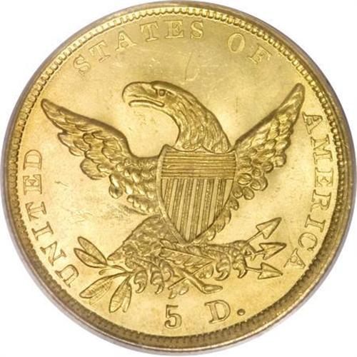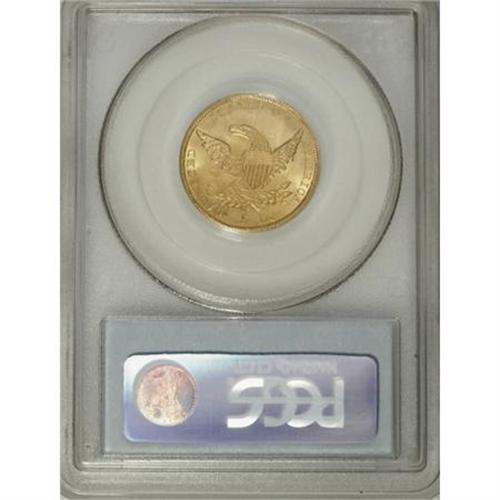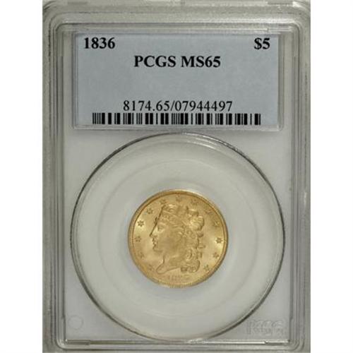 <B>1836 $5 MS65 PCGS.</B></I> Small Head, Large Date, Breen-6508, McCloskey 5-D, R.3. A Block 8 obverse with a small, evenly sized date is paired with a reverse that has the truncation of the olive branch's stem almost exactly corresponding to the top of the D in the denomination. Production of the half eagle was heavy in 1836; after the 1834 Plain 4, it is the second most available among Classic Head issues, with an original mintage of over half a million pieces.<BR> While Classic Head gold retains a high degree of difficulty overall, the 1836 remains accessible, or in higher grades, available for a price. As Garrett and Guth write in their <I>Encyclopedia of U.S. Gold Coins</B></I>, " ... collectors should have no problem acquiring examples for their collections, even in Mint State." Gems, however, prove far more elusive; at the time of writing (2006), Garrett and Guth knew of only one MS65 piece, which was certified by PCGS. Since then, the combined certified population has expanded, with NGC and PCGS claiming two examples each, though how many of these are resubmissions is unknown.<BR> Whether it is the long-coveted PCGS MS65 coin noted by Garrett and Guth or a Johnny-come-lately to the upper echelons of the <I>Population Report</B></I>, this amazing Gem offers incredible vibrancy and undeniable eye appeal. The strike is crisp overall, certainly above-average, even if a hint of softness appears on Liberty's curls near the forehead. Rich butter-yellow surfaces with hints of pink and orange showcase swirling luster. Though a handful of tiny marks appear in the reverse fields, these are appropriate for the grade and minor in context. An impressive piece that would serve well as either a Classic gold collection highlight or a top-notch type coin.<BR><BR><B>Coin Engraver:</B> William Kneass<BR><BR><b>Shipping:</b> Coins & Currency (<a target="_blank" href="http://www.heritageauctions.com/common/shipping.php">view shipping information</a>)