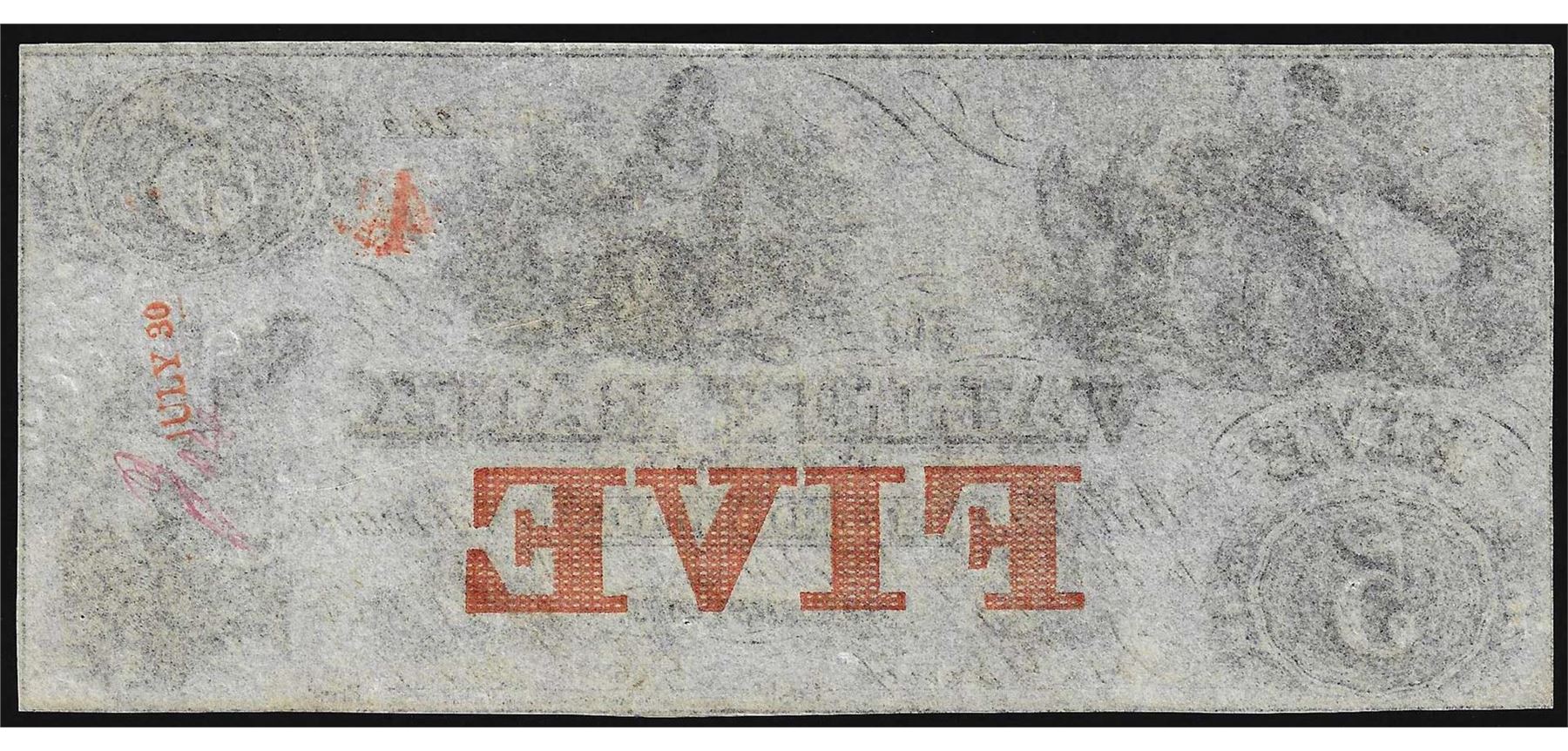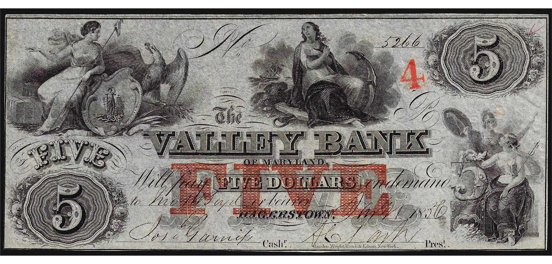 One 1836 $5 The Valley Bank of Maryland Obsolete Bank Note.