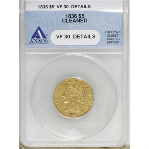 <B>1836 $5 --Cleaned--ANACS. VF30 Details.</B></I> NGC Census: (19/803). PCGS Population (25/508). Mintage: 553,147. Numismedia Wsl. Price for NGC/PCGS coin in VF30: $614. (#8174)<BR><BR><B>Coin Engraver:</B> William Kneass<BR><BR><b>Shipping:</b> Coins & Currency (<a target="_blank" href="http://www.heritageauctions.com/common/shipping.php">view shipping information</a>)