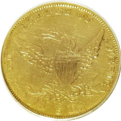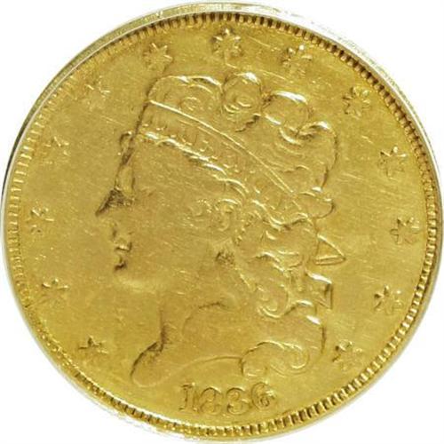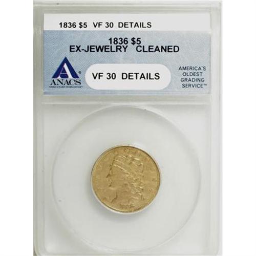 <B>1836 $5 --Cleaned, Ex-Jewelry--ANACS. VF30 Details.</B></I> NGC Census: (19/809). PCGS Population (25/510). Mintage: 553,147. Numismedia Wsl. Price for NGC/PCGS coin in VF30: $614. (#8174)<BR><BR><B>Coin Engraver:</B> William Kneass<BR><BR><b>Shipping:</b> Coins & Currency (<a target="_blank" href="http://www.heritageauctions.com/common/shipping.php">view shipping information</a>)