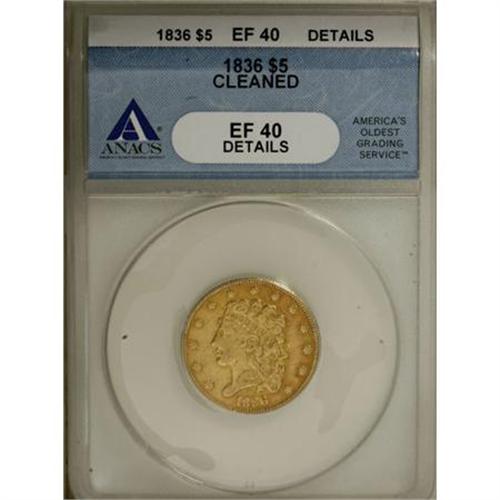 <B>1836 $5 --Cleaned--ANACS. XF40 Details.</B></I> Second Head, Large Date, Breen-6509, McCloskey 6-E, R.4. Among the scarcer die varieties of the year, identified by the vertical die crack from 6 o'clock to the curls left of Liberty's ear. Honey-gold luster clings to recesses of this typically abraded and slightly subdued representative.<BR><BR><B>Coin Engraver:</B> William Kneass<BR><BR><b>Shipping:</b> Coins & Currency (<a target="_blank" href="http://www.heritageauctions.com/common/shipping.php">view shipping information</a>)