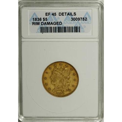 <B>1836 $5 --Rim Damaged--ANACS. XF45 Details.</B></I> NGC Census: (101/603). PCGS Population (94/306). Mintage: 553,147. Numismedia Wsl. Price for NGC/PCGS coin in XF45: $1,018. (#8174)<BR><BR><B>Coin Engraver:</B> William Kneass<BR><BR><b>Shipping:</b> Coins & Currency (<a target="_blank" href="http://www.heritageauctions.com/common/shipping.php">view shipping information</a>)
