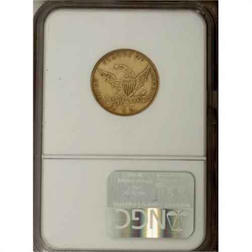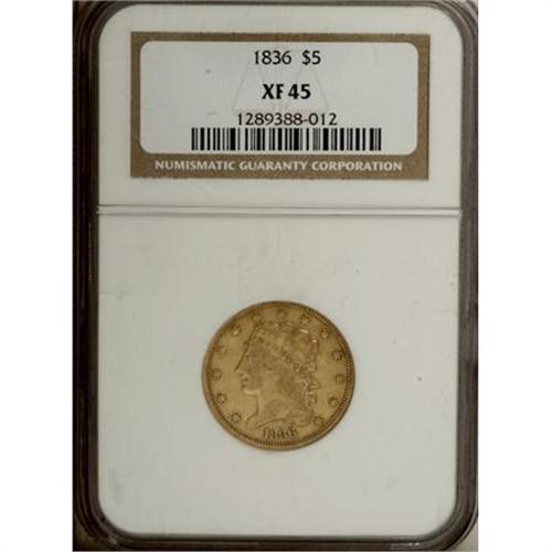 <B>1836 $5 XF45 NGC.</B></I> Third Head, Breen-6510, McCloskey 3-C, R.2. The date is wide when compared to other examples, and on the reverse, the D in the denomination is partly under the tip of the olive stem. This pleasant example shows a bit of striking weakness in the centers and even, green-gold surfaces that are clean. <BR><BR><B>Coin Engraver:</B> William Kneass<BR><BR><b>Shipping:</b> Coins & Currency (<a target="_blank" href="http://www.heritageauctions.com/common/shipping.php">view shipping information</a>)