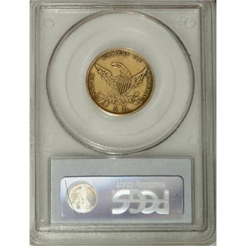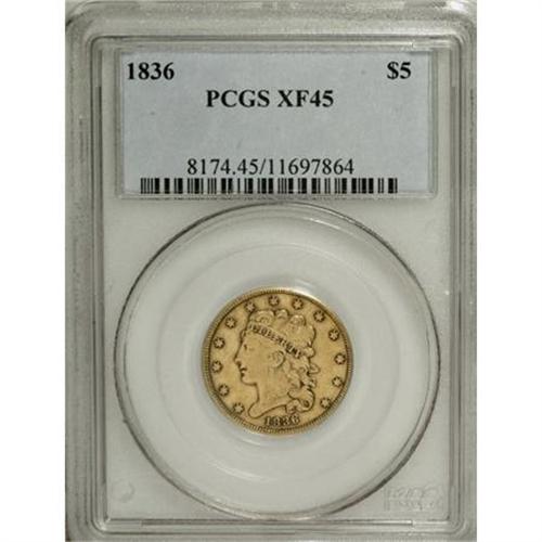<B>1836 $5 XF45 PCGS.</B></I> Small Head, Large Date, Breen-6508, McCloskey 5-D, R.3. A moderately circulated Classic gold type coin. Glimpses of dirt within design recesses confirm the originality. A thin horizontal mark on the upper right reverse field is of only minor concern.<BR><BR><b>Shipping:</b> Coins & Currency (<a target="_blank" href="http://www.heritageauctions.com/common/shipping.php">view shipping information</a>)