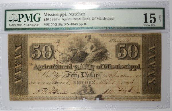 1836 $50 NATCHEZ, MS ( AGRICULTURAL BANK OF MISSISSIPPI PMG 15