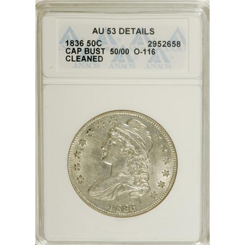 <B>1836 50C 50 Over 00--Cleaned--ANACS. AU53 Details.</B></I> O-116, R.2. NGC Census: (4/23). PCGS Population (7/15). Numismedia Wsl. Price: $700. (#6170)<BR><BR><b>Shipping:</b> Coins & Currency (<a target="_blank" href="http://www.heritageauctions.com/common/shipping.php">view shipping information</a>)