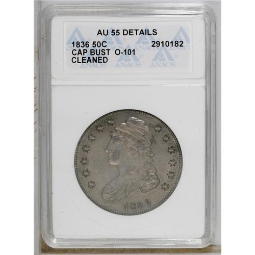 <B>1836 50C Lettered Edge--Cleaned--ANACS. AU55 Details.</B></I> O-101. NGC Census: (7/16). PCGS Population (4/11). Numismedia Wsl. Price: $825. (#6170)<BR><BR><b>Shipping:</b> Coins & Currency (<a target="_blank" href="http://www.heritageauctions.com/common/shipping.php">view shipping information</a>)
