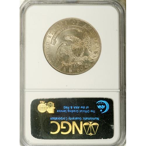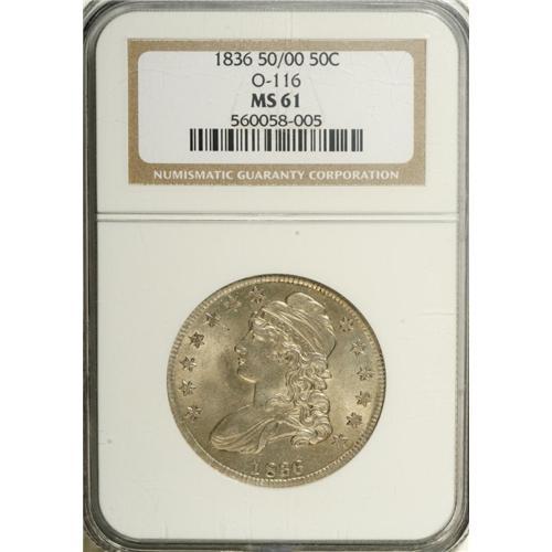 <B>1836 50C 50 Over 00 MS61 NGC.</B></I> O-116, R.2. Gentle apricot and battleship-gray toning visits this shimmering and surprisingly unmarked example. A bit softly struck on the uppermost obverse stars and the denomination, characteristic of this <I>Guide Book</B></I> variety. Population: 1 in 61, 7 finer (12/06).<BR><I>From The Rocky Top Collection of Bust Half Dollars.</B></I><BR><BR><b>Shipping:</b> Coins & Currency (<a target="_blank" href="http://www.heritageauctions.com/common/shipping.php">view shipping information</a>)