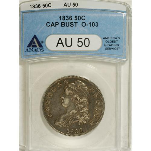 <B>1836 50C Lettered Edge AU50 ANACS.</B></I> O-103. NGC Census: (40/643). PCGS Population (71/492). Mintage: 6,545,000. Numismedia Wsl. Price for NGC/PCGS coin in AU50: $221. (#6169)<BR><BR><b>Shipping:</b> Coins & Currency (<a target="_blank" href="http://www.heritageauctions.com/common/shipping.php">view shipping information</a>)