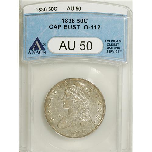 <B>1836 50C Lettered Edge AU50 ANACS.</B></I> O-110. NGC Census: (80/1290). PCGS Population (71/492). Mintage: 6,545,000. Numismedia Wsl. Price for NGC/PCGS coin in AU50: $221. (#6169)<BR><BR><b>Shipping:</b> Coins & Currency (<a target="_blank" href="http://www.heritageauctions.com/common/shipping.php">view shipping information</a>)