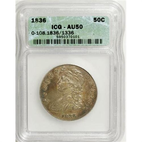 <B>1836 50C 1836/1836 Lettered Edge AU50 ICG.</B></I> O-108. NGC Census: (40/653). PCGS Population (81/522). Mintage: 6,545,000. Numismedia Wsl. Price for NGC/PCGS coin in AU50: $221. (#6169)<BR><BR><B>Coin Engraver:</B> John Reich<BR><BR><b>Shipping:</b> Coins & Currency (<a target="_blank" href="http://www.heritageauctions.com/common/shipping.php">view shipping information</a>)