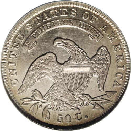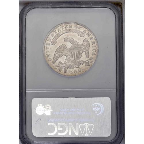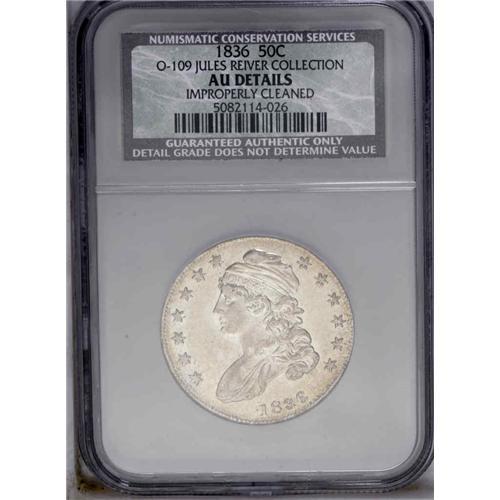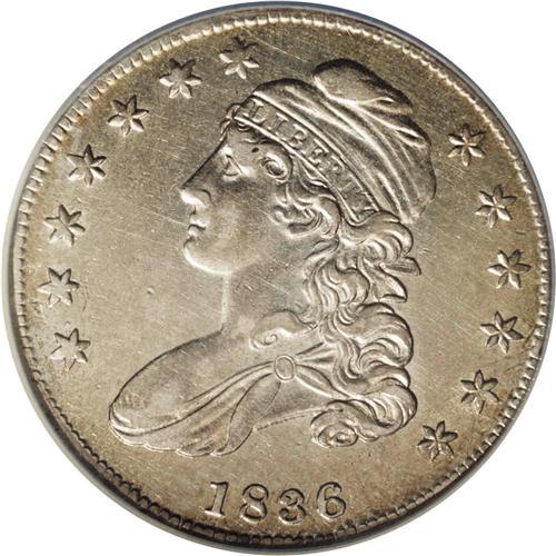 <B>1836<50C> Lettered Edge AU50--Improperly Cleaned--NCS. AU Details.</B></I> O-109, R.4. A spike jutting from the top of star seven most easily distinguishes this variety's obverse. The reverse has a center dot between crossbars three and four. The fields on the present example are harsh and garish from zealous cleaning, softened only slightly by a light copper-gold patina. The strike is fairly bold, although soft on Liberty's hair curl above the clasp and on the eagle's left (facing) wing. Examination with a glass reveals extensive fine hairlining and abrasions. Envelope Included.