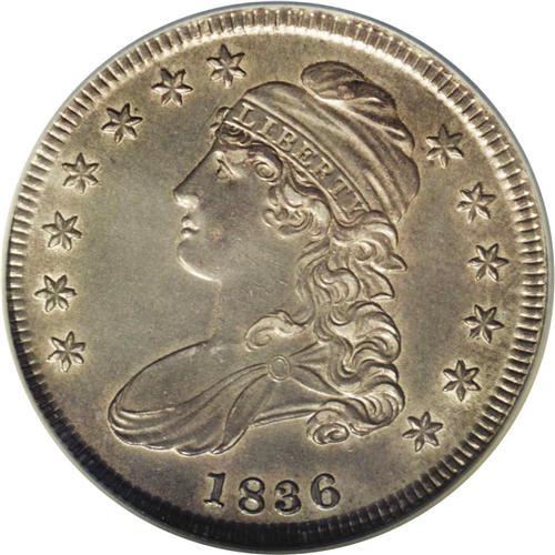 <B>1836<50C> Lettered Edge AU50--Improperly Cleaned--NCS. AU Details.</B></I> O-113, R.2. This is the "doubled drapery clasp" variety, in which an engraver modified a working die to produce this "bit of engraver's art," as Overton calls it. The reverse features a 5 in the denomination that is sharply higher than the 0. The present example is smoky-gray on the obverse with silver highpoints and glints of peripheral copper, while the reverse offers a livelier color blend of bronze, aqua, and sunset-orange. The strike is bold, with little weakness noted. Perusal with a glass shows several small abrasions on Liberty's cheek. The reverse die is rotated about 30 degrees clockwise. Envelope Included.