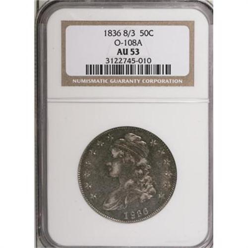 <B>1836 8/3 50C Lettered Edge AU53 NGC.</B></I> O-108A. NGC Census: (65/607). PCGS Population (67/469). Mintage: 6,545,000. Numismedia Wsl. Price for NGC/PCGS coin in AU53: $365. (#6169)<BR><BR><B>Coin Engraver:</B> John Reich<BR><BR><b>Shipping:</b> Coins & Currency (<a target="_blank" href="http://www.heritageauctions.com/common/shipping.php">view shipping information</a>)
