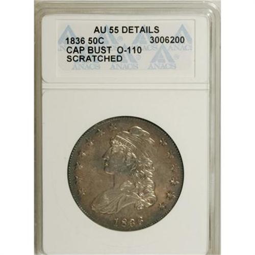 <B>1836 50C Cap Bust, Lettered Edge--Scratched--ANACS. AU55 Details.</B></I> O-110. NGC Census: (120/472). PCGS Population (110/339). Mintage: 6,545,000. Numismedia Wsl. Price for NGC/PCGS coin in AU55: $275. (#6169)<BR><BR><B>Coin Engraver:</B> John Reich<BR><BR><b>Shipping:</b> Coins & Currency (<a target="_blank" href="http://www.heritageauctions.com/common/shipping.php">view shipping information</a>)
