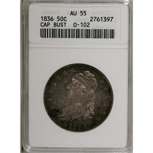 <B>1836 50C Lettered Edge AU55 ANACS.</B></I> O-102. NGC Census: (121/486). PCGS Population (115/354). Mintage: 6,545,000. Numismedia Wsl. Price for NGC/PCGS coin in AU55: $450. (#6169)<BR><BR><B>Coin Engraver:</B> John Reich<BR><BR><b>Shipping:</b> Coins & Currency (<a target="_blank" href="http://www.heritageauctions.com/common/shipping.php">view shipping information</a>)