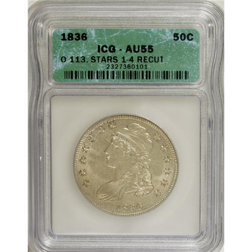 <B>1836 50C Lettered Edge--Stars 1-4 Recut-- AU55 ICG.</B></I> O-113.NGC Census: (118/466). PCGS Population (104/331). Mintage: 6,545,000. Numismedia Wsl. Price: $275. (#6169)<BR><BR><b>Shipping:</b> Coins & Currency (<a target="_blank" href="http://www.heritageauctions.com/common/shipping.php">view shipping information</a>)