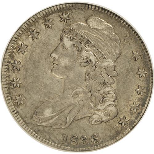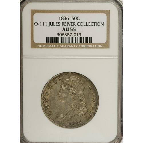 <B>1836 50C Lettered Edge AU55 NGC.</B></I> O-111 Ex:Jules Reiver Collection. NGC Census: (118/470). PCGS Population (105/333). Mintage: 6,545,000. Numismedia Wsl. Price for NGC/PCGS coin in AU55: $275. (#6169)<BR><BR><b>Shipping:</b> Coins & Currency (<a target="_blank" href="http://www.heritageauctions.com/common/shipping.php">view shipping information</a>)
