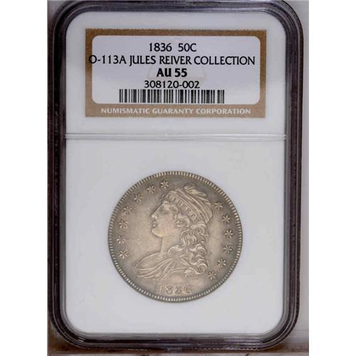 <B>1836<50C> Lettered Edge AU55 NGC.</B></I> O-113A. R.3. Pearl gray toning at the centers changes to gunmetal gray and navy blue at the rims. The obverse exhibits a sharp curving die crack that extends from the upper ribbon tip, through the twelfth star to the rim at five o'clock. The reverse die crack described at the tops of the letters TATES is not present on this example. <BR><I>Ex: Conroy (1/23/1988).</B></I> Envelope Included.