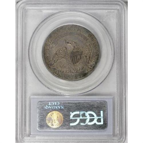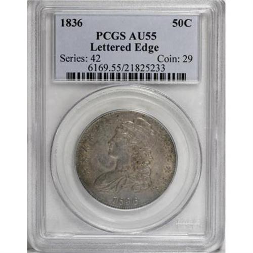 <B>1836 50C Lettered Edge AU55 PCGS.</B></I> O-123, R.4. Olive-gold luster emerges from crevices of the smooth gunmetal-gray surfaces. This better variety Capped Bust half has only moderate wear on the forehead and the hair above the ear.<BR><BR><B>Coin Engraver:</B> John Reich<BR><BR><b>Shipping:</b> Coins & Currency (<a target="_blank" href="http://www.heritageauctions.com/common/shipping.php">view shipping information</a>)