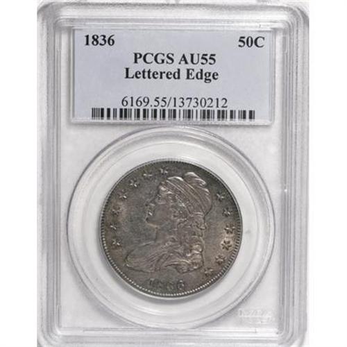 <B>1836 50C Lettered Edge AU55 PCGS.</B></I> PCGS Population (115/347). NGC Census: (121/482). Mintage: 6,545,000. Numismedia Wsl. Price for NGC/PCGS coin in AU55: $425. (#6169)<BR><BR><B>Coin Engraver:</B> John Reich<BR><BR><b>Shipping:</b> Coins & Currency (<a target="_blank" href="http://www.heritageauctions.com/common/shipping.php">view shipping information</a>)