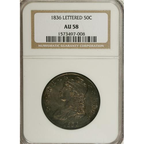 <B>1836 50C Lettered Edge AU58 NGC.</B></I> NGC Census: (197/273). PCGS Population (143/190). Mintage: 6,545,000. Numismedia Wsl. Price for NGC/PCGS coin in AU58: $585. (#6169)<BR><BR><b>Shipping:</b> Coins & Currency (<a target="_blank" href="http://www.heritageauctions.com/common/shipping.php">view shipping information</a>)