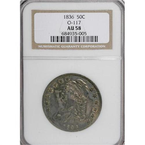 <B>1836 50C Lettered Edge AU58 NGC.</B></I> O-117. NGC Census: (205/281). PCGS Population (155/199). Mintage: 6,545,000. Numismedia Wsl. Price for NGC/PCGS coin in AU58: $620. (#6169)<BR><BR><B>Coin Engraver:</B> John Reich<BR><BR><b>Shipping:</b> Coins & Currency (<a target="_blank" href="http://www.heritageauctions.com/common/shipping.php">view shipping information</a>)