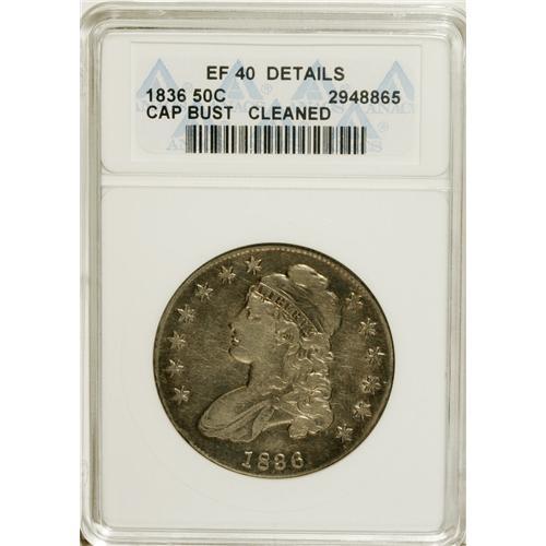 <B>1836 50C Lettered Edge--Cleaned--ANACS. XF40 Details.</B></I> NGC Census: (58/1500). PCGS Population (48/631). Mintage: 6,545,000. Numismedia Wsl. Price for NGC/PCGS coin in XF40: $71. (#6169)<BR><BR><b>Shipping:</b> Coins & Currency (<a target="_blank" href="http://www.heritageauctions.com/common/shipping.php">view shipping information</a>)