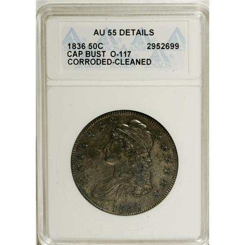 <B>1836 50C Lettered Edge--Cleaned, Corroded--ANACS. AU55 Details.</B></I> O-117, R.3. NGC Census: (117/467). PCGS Population (104/331). Mintage: 6,545,000. Numismedia Wsl. Price: $275. (#6169)<BR><BR><b>Shipping:</b> Coins & Currency (<a target="_blank" href="http://www.heritageauctions.com/common/shipping.php">view shipping information</a>)