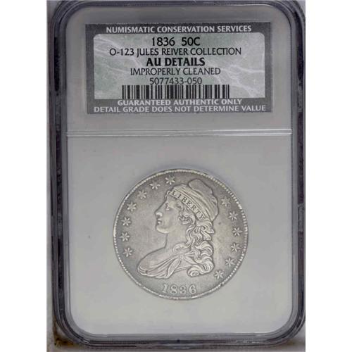 <B>1836<50C> Lettered Edge--Improperly Cleaned--NCS. AU Details.</B></I> O-123. R.3. Pearl gray toning on the highpoints deepens to gunmetal gray in the fields. Close examination reveals a few scattered rim bumps, the most prominent is noted at five o'clock on the reverse. <BR><I>Ex: Merkel (11/24/1986).</B></I> Envelope Included.