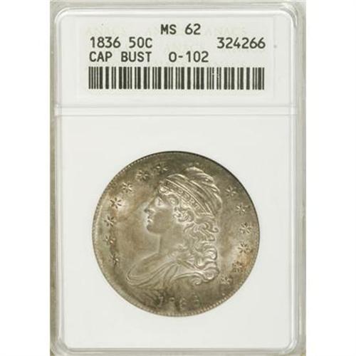 <B>1836 50C Lettered Edge MS62 ANACS.</B></I> O-102, R.3. Golden-gray and aqua-blue invigorate the obverse, while the reverse features tan-gold, plum, and emerald-blue toning. Well struck at the borders with minor incompleteness near the centers.<BR><BR><B>Coin Engraver:</B> John Reich<BR><BR><b>Shipping:</b> Coins & Currency (<a target="_blank" href="http://www.heritageauctions.com/common/shipping.php">view shipping information</a>)