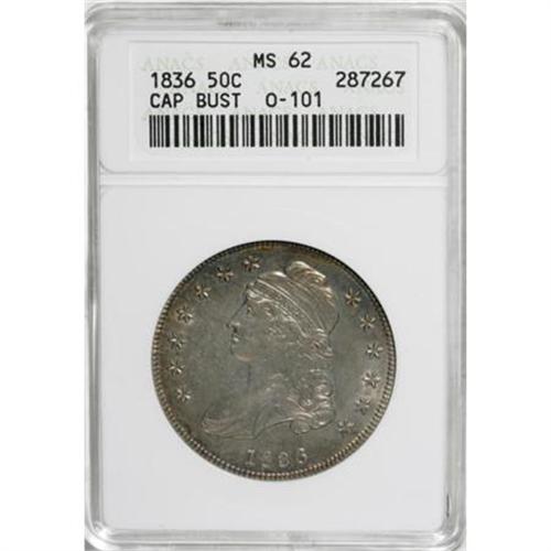 <B>1836 50C Lettered Edge MS62 ANACS.</B></I> O-101, R.1. This shimmering final-year type coin is bathed in autumn-gold, olive, and aquamarine. Unabraded save for a few inconspicuous obverse hairlines. Sharply brought up save for the central hair curls.<BR><BR><B>Coin Engraver:</B> John Reich<BR><BR><b>Shipping:</b> Coins & Currency (<a target="_blank" href="http://www.heritageauctions.com/common/shipping.php">view shipping information</a>)