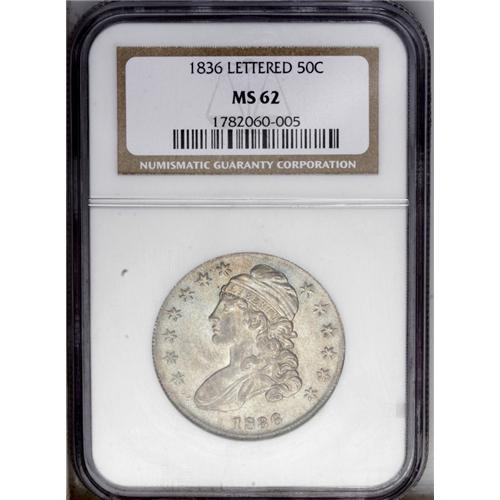 <B>1836<50C> Lettered Edge MS62 NGC.</B></I> O-112, R.1. Tawny-gold and aquamarine hues endow this lustrous and relatively unabraded representative. Some striking bluntness on the eagle's head and the LUR in PLURIBUS is often encountered for the type. <BR><BR><B>Important notice:</B> Heritage usually auctions material at the rate of 200-250 lots per hour. On some occasions eBay Live bid software or the Internet may not be able to keep up with the pace of the auction. We recommend placing a realistic absentee bid now as insurance to avoid disappointment. Occasionally the auctioneer may eliminate or reject an eBay Live bid, and the auctioneer may also reopen a lot after the close of the eBay live bidding (usually because we missed an audience bid), and may reject your bid even if it shows you as the winning bidder. By bidding via eBay Live, you agree that Heritage may award the lot to another bidder at its sole discretion under the circumstances described above or any other reasonable circumstances. Since eBay bids are not shown to us until we open the lot on the floor, we treat those bids just like floor bids. In most cases the floor responds before the eBay bid is presented to us, due to Internet lag time, so for consistency we have made it a policy that floor bids are always considered first over tie eBay live bids. Also please note that all Heritage lots purchased through eBay Live carry a 20% Buyer's Premium. Please make sure you read the Terms and Conditions before you bid. This lot is being auctioned in conjunction with a live floor auction by Heritage Galleries & Auctioneers. All final auction and invoice information will be supplied by Heritage Galleries & Auctioneers, and all other information should be considered preliminary. Lot:1972 <BR><BR><B>Winning Notification and Billing:</B> After the FINAL session in this auction is complete, Heritage will send e-mail and snail mail invoices. This process normally takes several days. All final auction and invoice information will be supplied by Heritage Galleries & Auctioneers, and all other information should be considered preliminary. <BR><BR>This auction will be conducted on a live auction floor and over the Internet through eBay Live. If you choose to place an absentee bid, please take a moment to <font color='#0000ff'><u><a href='http://pages.ebay.com/liveauctions/help/before/laabsentee.html'>learn how eBay Live absentee bidding works</a></u></font><font color='#000000'>