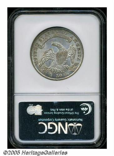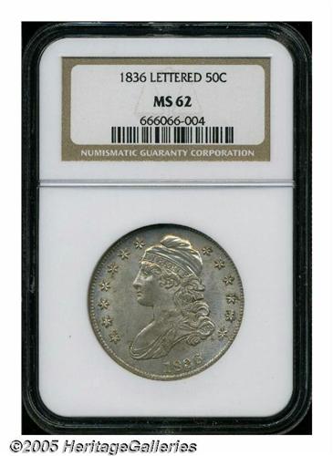 <B>1836<50C> Lettered Edge MS62 NGC.</B></I> O-122, R.2. A nicely struck silver-gray final year Lettered Edge Half Dollar that has unbroken cartwheel shimmer and no distracting marks.