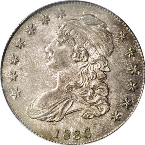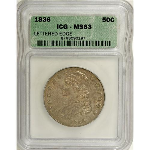 <B>1836 50C Lettered Edge MS63 ICG.</B></I> O-110, R.1. Both sides of this piece have soft, frosty luster beneath gray-brown toning that is lighter in appearance on the reverse. Although not a full strike, most of the design features are bold.<BR><I>From The Westmoreland, Virginia Collection, Part Two.</B></I><BR><BR><b>Shipping:</b> Coin/Currency (<a target="_blank" href="http://www.heritageauctions.com/common/shipping.php">view shipping information</a>)