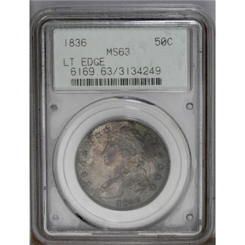 <B>1836 50C Lettered Edge MS63 PCGS.</B></I> O-113a, R.3. Dappled mauve, cobalt-blue, and golden-gray earth tones embrace this reasonably struck and carefully preserved Bust Half. Several lengthy slender die cracks emerge when the piece is examined beneath a lens. Encapsulated in a green label holder.<BR><I>From The Westmoreland, Virginia Collection.</B></I>