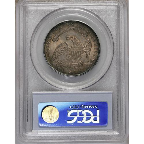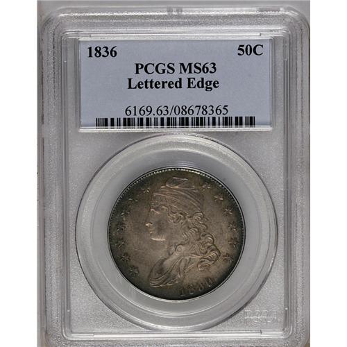 <B>1836<50C> Lettered Edge MS63 PCGS.</B></I> O-114, R.2. Star 7 is widely recut, and this confirms the Overton variety of this final-year Lettered Edge half. This satiny representative has dusky golden-brown, plum, and powder-blue toning. The strike is sharp save for stars 6 and 7, and the absence of noticeable marks confirms the quality.