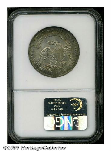 <B>1836<50C> Lettered Edge MS64 NGC.</B></I> O-108a, R.2. This is the well-known 1836 / 1336 variety, and it is a recognized Redbook variety. The knob of the previously punched 3 is clearly seen within the lower loop of the 8. This is also one of the finer examples known with the 1990 Condition Census (65, 64, 63, 60, 60). The mint luster on this coin is frosted and quite pronounced, even under several layers of olive, rose, and lilac toning. A lovely Choice Uncirculated example of this popular and widely collected variety.