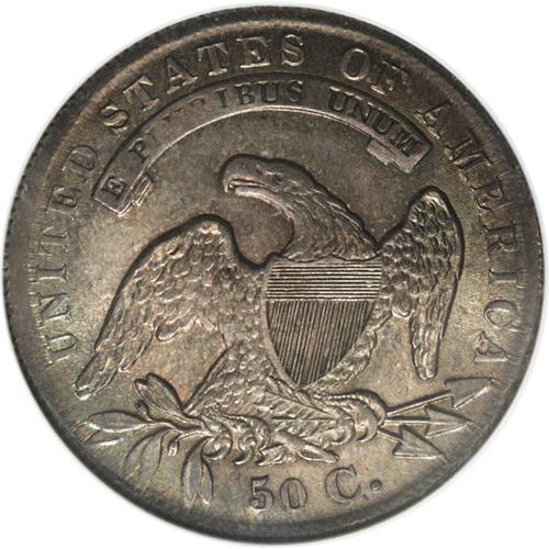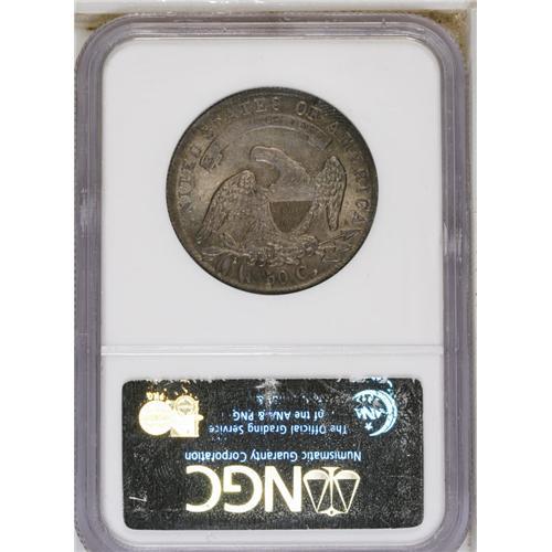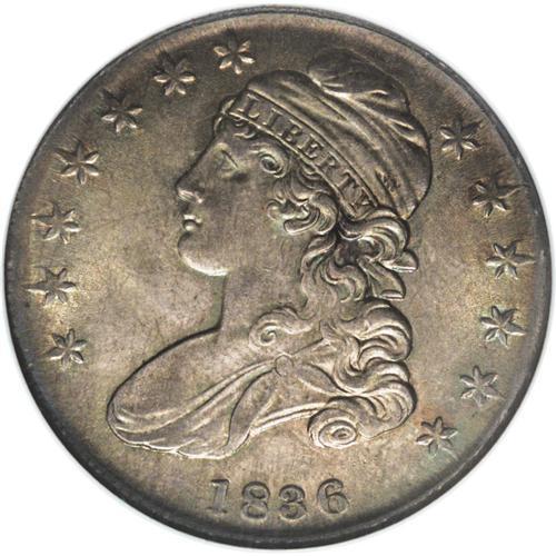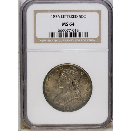 <B>1836 50C Lettered Edge MS64 NGC.</B></I> O-112, R.1. The bar dot variety is distinguished by a protrusion from the right loop of the 6 in the date, and by a die line connecting the two lower arrowheads. Golden-gray and sea-green toning does not deny the sweeping satin luster. Not fully struck, but refreshingly unblemished. Although common in circulated grades, the 1836 O-112 is elusive in Mint State. The Condition Census for the O-112 in Overton ranges from MS62 to MS65.<BR><BR><b>Shipping:</b> Coin/Currency (<a target="_blank" href="http://www.heritageauctions.com/common/shipping.php">view shipping information</a>)