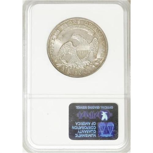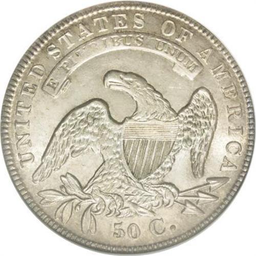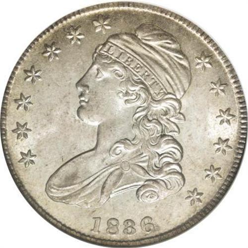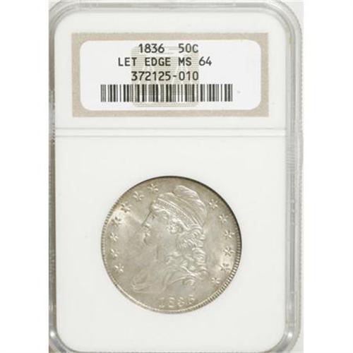 <B>1836 50C Lettered Edge MS64 NGC.</B></I> O-112, R.1. One of four "Bar Dot" Overton varieties for the date. In each case, the mint-made dot is located slightly east of the 6. O-112 is also identified by a brief die scratch between the lower two arrowheads. The lustrous surfaces are mostly brilliant across the interiors and have delicate golden peripheral accents. <BR><I>From The Mario Eller Collection, Part Two.</B></I><BR><BR><B>Coin Engraver:</B> John Reich<BR><BR><b>Shipping:</b> Coins & Currency (<a target="_blank" href="http://www.heritageauctions.com/common/shipping.php">view shipping information</a>)
