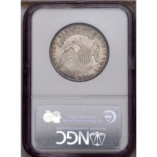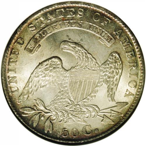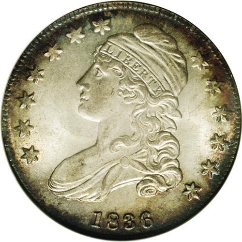 <B>1836<50C> Lettered Edge MS65 NGC.</B></I> O-106, R.1. The reverse die has a heavy crack from the rim through the middle arrow point, continuing up through the upper arrowhead, the eagle's wing, and the field above, reaching the scroll below the S. Fully lustrous with frosty surfaces and extremely pleasing ivory color. Both sides are accented by peripheral iridescence, more prominent on the obverse.
