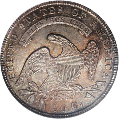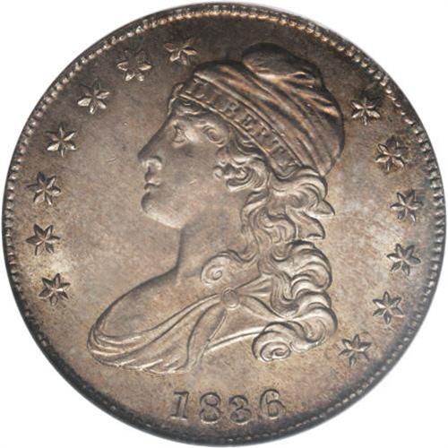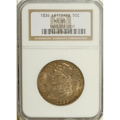 <B>1836 50C Lettered Edge MS65 NGC.</B></I> O-114, R.2. Star 7 is prominently recut. The 3 in the date is small and leans further to the left than the other digits. On the reverse, the center line of stripe 1 extends to the second crossbar. Gorgeous plum-gray and red-orange toning is highlighted by the rich, full luster on both sides. Surface marks are nearly nonexistent.<BR><I>From The Rocky Top Collection of Bust Half Dollars.</B></I><BR><BR><b>Shipping:</b> Coins & Currency (<a target="_blank" href="http://www.heritageauctions.com/common/shipping.php">view shipping information</a>)