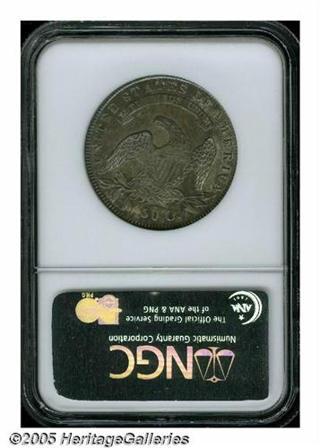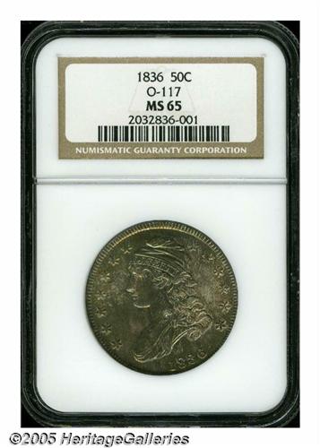 <B>1836<50C> Lettered Edge MS65 NGC.</B></I> O-117, R.3. Deeply and originally toned with iridescent green, blue, and gold colorations appearing in a somewhat mottled fashion over each side. The toning gives the underlying lustrous surfaces a completely original appearance. A solid Gem that displays a reasonably good strike, save for the motto on the reverse, and no obvious abrasions. Population: 18 in 65, 9 finer (5/05).