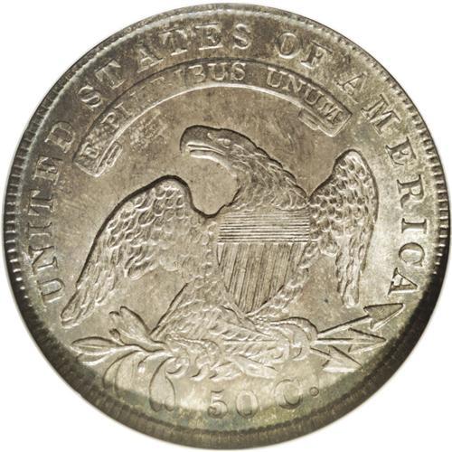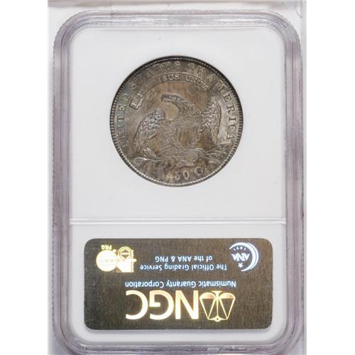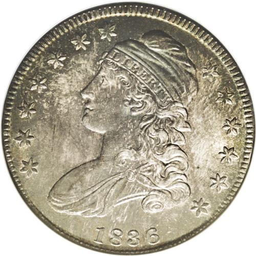 <B>1836<50C> Lettered Edge MS65 NGC.</B></I> O-117, R.3. Star 8 is recut on this die marriage, and the date is quite low. The first line of stripe 2 is solid to the second crossbar. This deeply and originally toned Gem offers iridescent green, blue, and gold patina over each side. The toning gives the underlying lustrous surfaces a completely original appearance. A solid MS65 that displays a reasonably good strike, save for the motto on the reverse, and no obvious abrasions. This lovely Gem is at or near the top of the Condition Census.